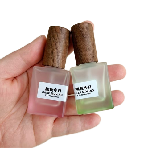 Botella pulverizadora de prensa de muestra pequeña de 10ml de gama alta, vidrio de grano de madera cuadrado con diseño esmerilado degradado, subembotellado de Perfume